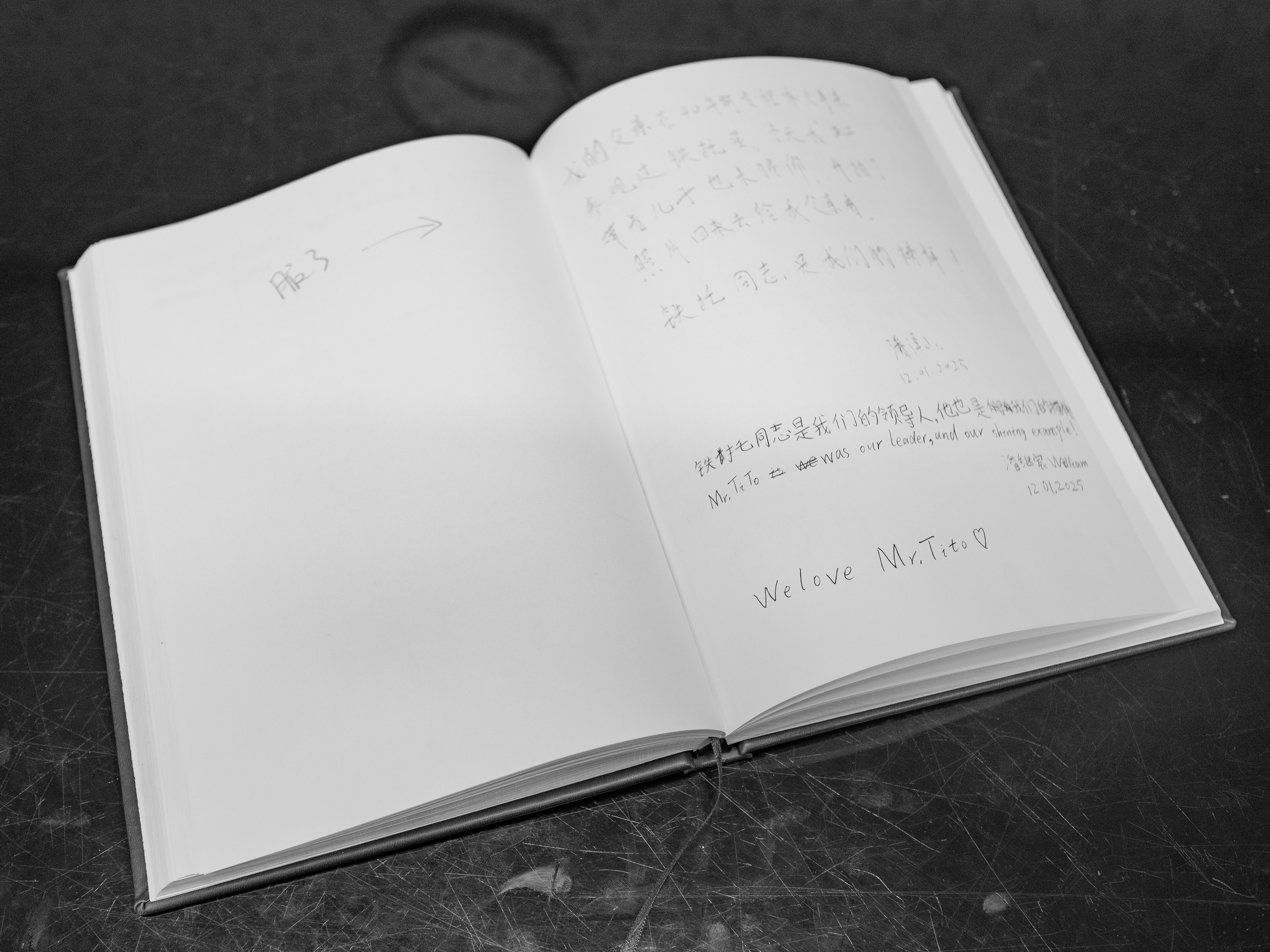 Gästebuch im Haus der Blumen, mit der Inschrift ,,Mr. Tito was our leader, and our shining example'' und ,,We love Mr. Tito''